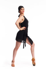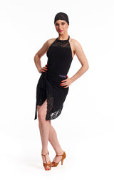 Experience a new twist on Latin dancing with this lace trimmed wrap skirt! The wrap over has an asymmetrical front hemline. Constructed to move with you, this skirt will make any routine more dynamic and captivating. Add a hint of romance and elegance to every step. Unleash your inner dancer! Add the Lace bodysuit and hair band for your fresh new look. Veronica is wearing a size S.